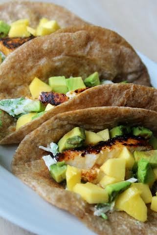 5. Add slaw mixture evenly into tortillas. Place tilapia on top of slaw. Then add the diced mango and avocado for the final touch.